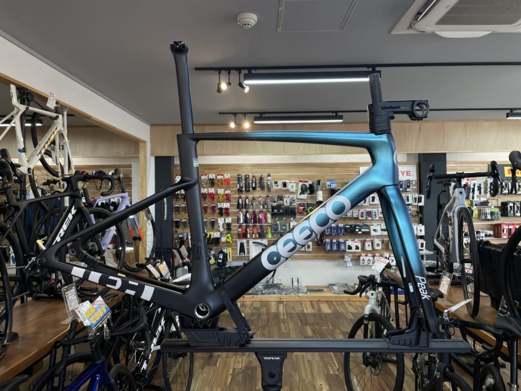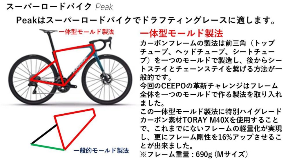 10月に発表されたばかりのCEEPOの世界戦略バイクであるスーパーロードバイク「Peak(ピーク)」がSTAR☆BIKESに入荷してきました。Peakは素材にTORAY M40Xを使用し、最新のカーボンフレーム製法によって開発され、フレーム重量690g(Mサイズ)という軽量ながらこれまでの製法のフレームと比べてフレーム剛性を16%アップされています。