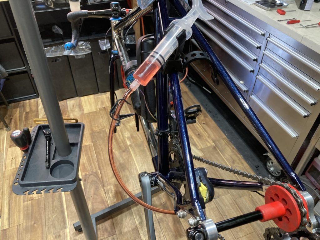 今回、「トウヨウ フレーム」に乗られているオーナー様よりブレーキオイル交換とバイクウォッシュのご依頼を頂きました。SHIMANO製ミネラルオイルは1年に1回のオイル交換を推奨しております。