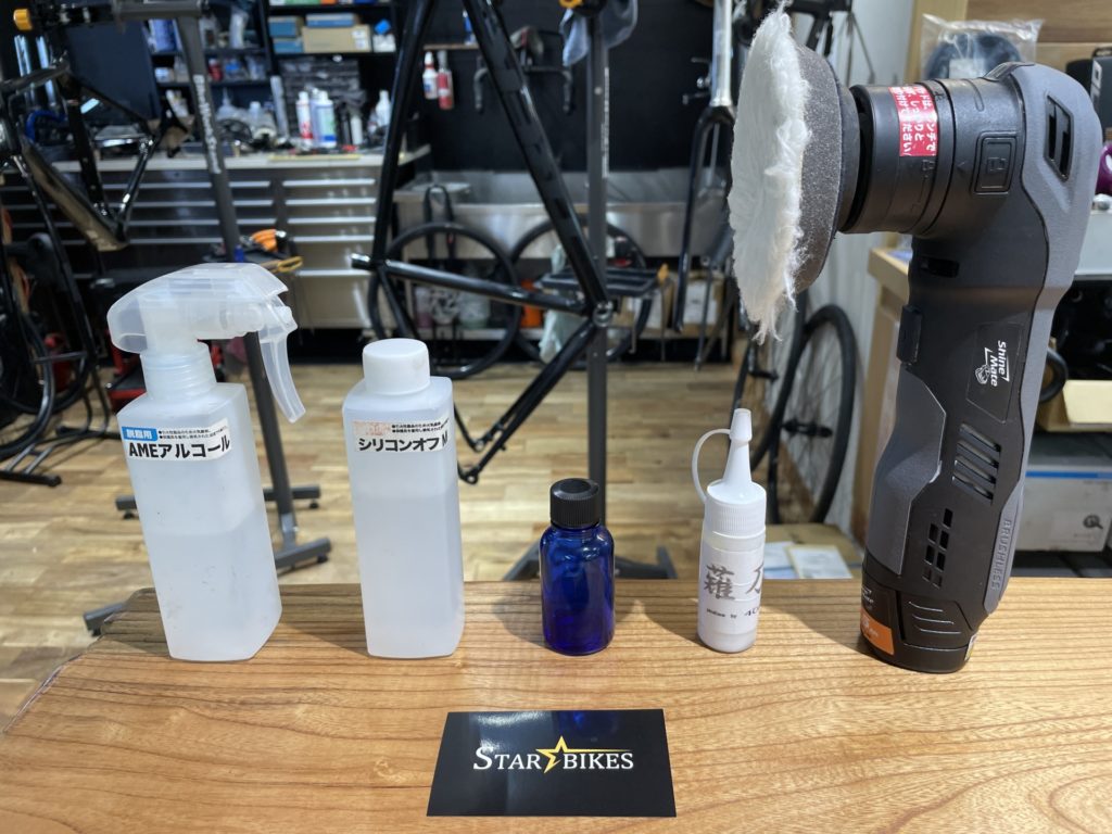クレストヨンド社によるガラスの鎧(青色の瓶)、カミナリの鎧(黒色の瓶)と専用の研磨機(右端) STAR☆BIKESでは車体購入時やオーバーホール受付時にフレームへのコー...