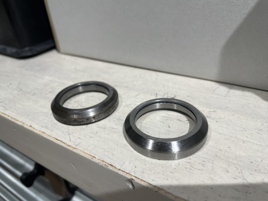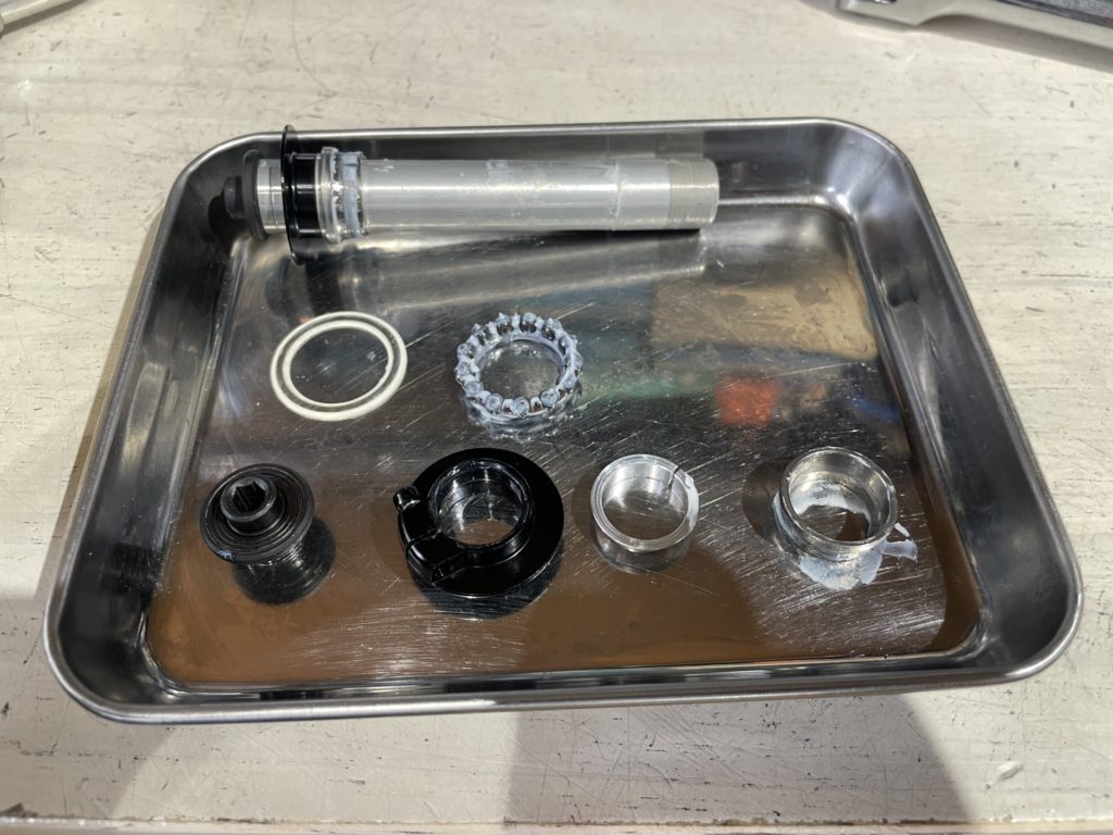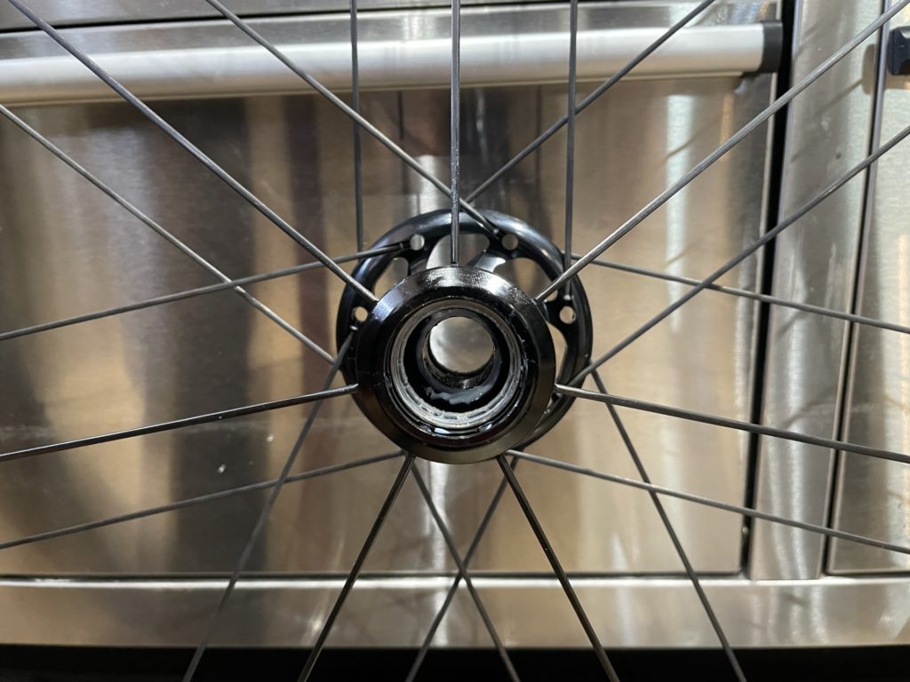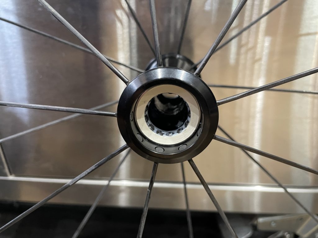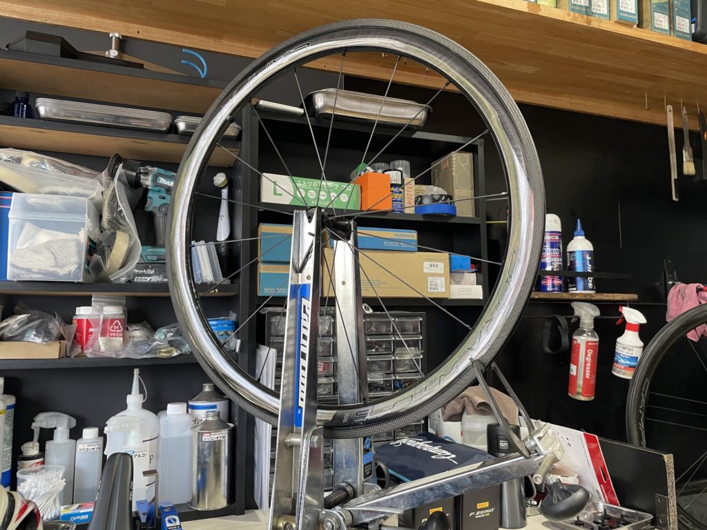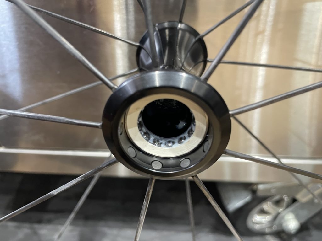 ホイールはベアリングの状態を確認するために分解。工場でのグリスが少なかったり、グリスの劣化が見られた場合はこちらで再塗布を行います。またカップアンドコーン式ベアリングの際は回転性能の向上とベアリングボールの摩耗を最小限に抑えるために丁寧に玉押し調整し、最後に振れ取り作業を行います。