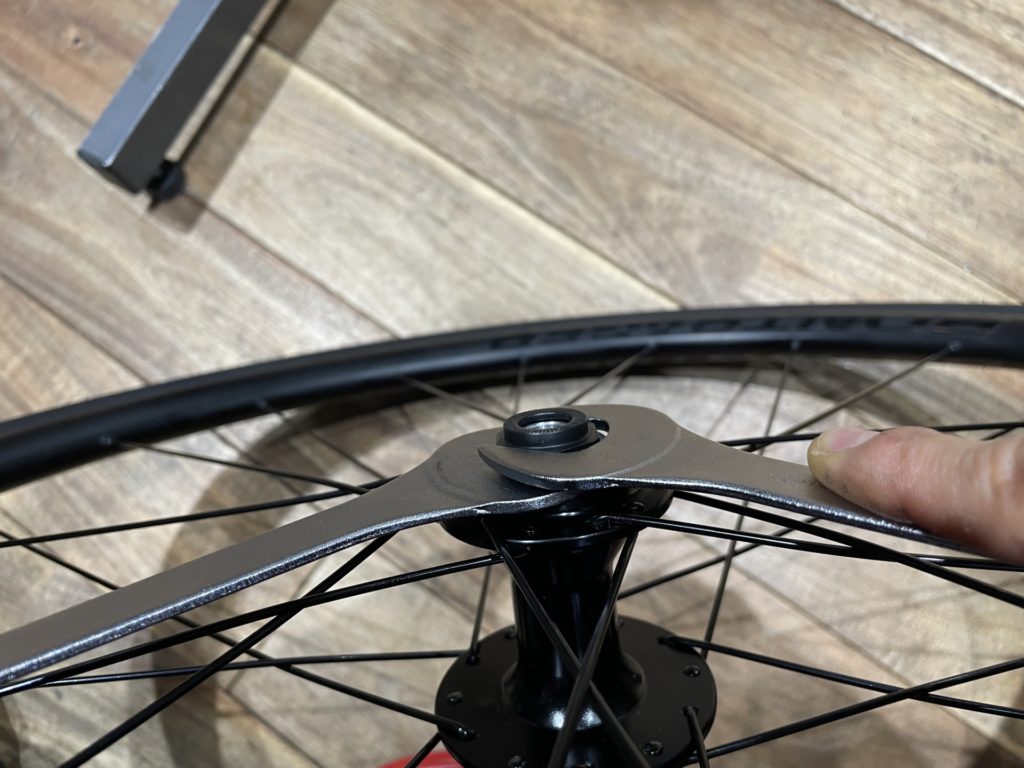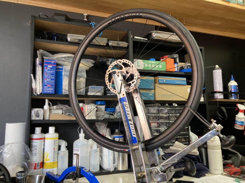 ホイールはベアリングの状態を確認するために分解。工場でのグリスが少なかったり、グリスの劣化が見られた場合はこちらで再塗布を行います。またカップアンドコーン式ベアリングの際は回転性能の向上とベアリングボールの摩耗を最小限に抑えるために丁寧に玉押し調整し、最後に振れ取り作業を行います。