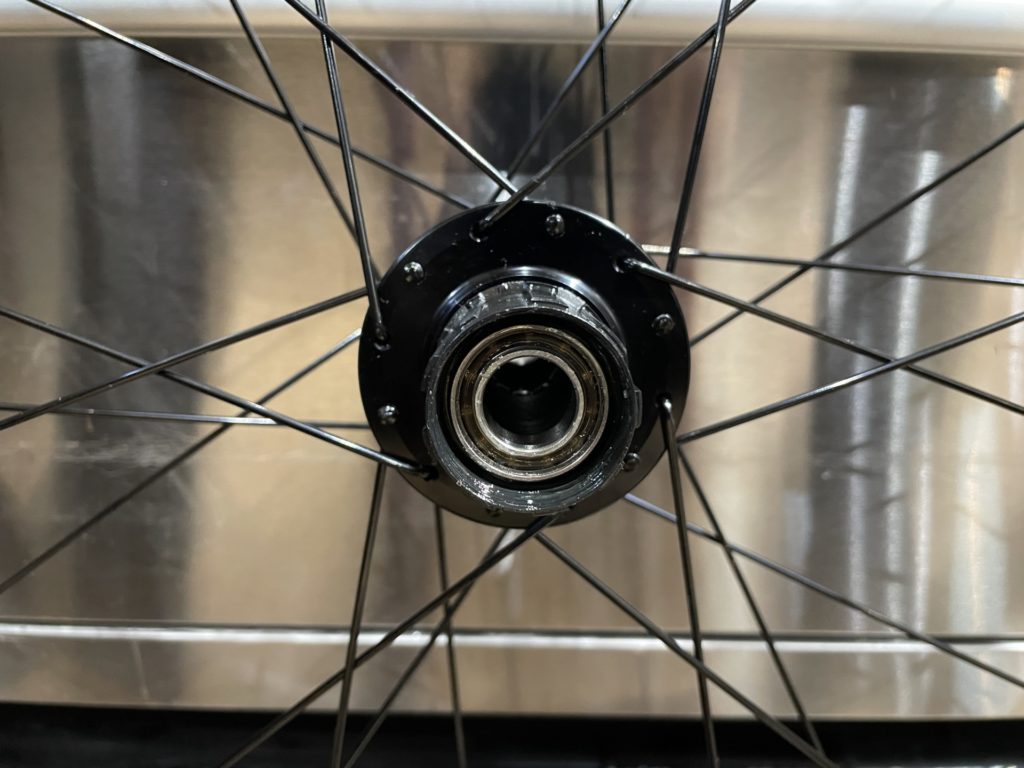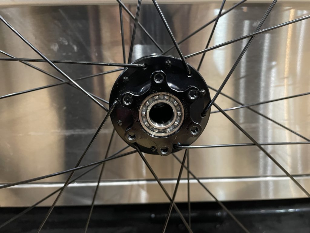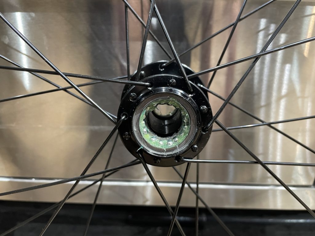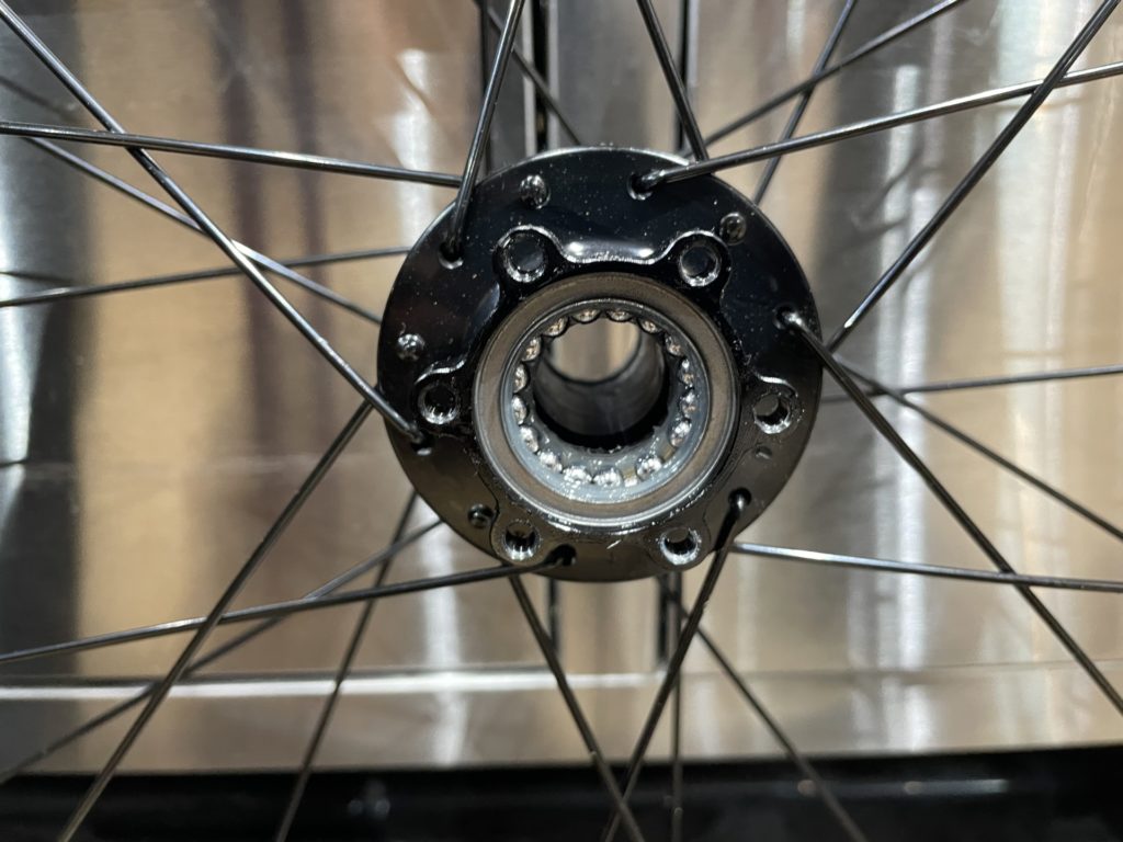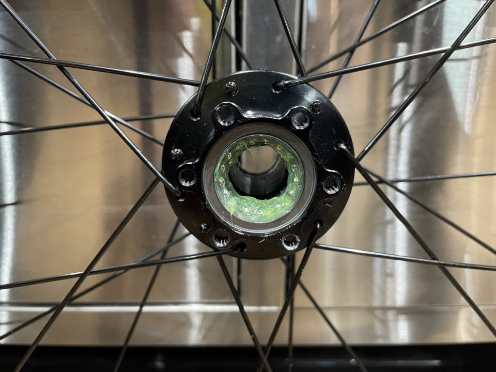 ホイールはベアリングの状態を確認するために分解。工場でのグリスが少なかったり、グリスの劣化が見られた場合はこちらで再塗布を行います。またカップアンドコーン式ベアリングの際は回転性能の向上とベアリングボールの摩耗を最小限に抑えるために丁寧に玉押し調整し、最後に振れ取り作業を行います。