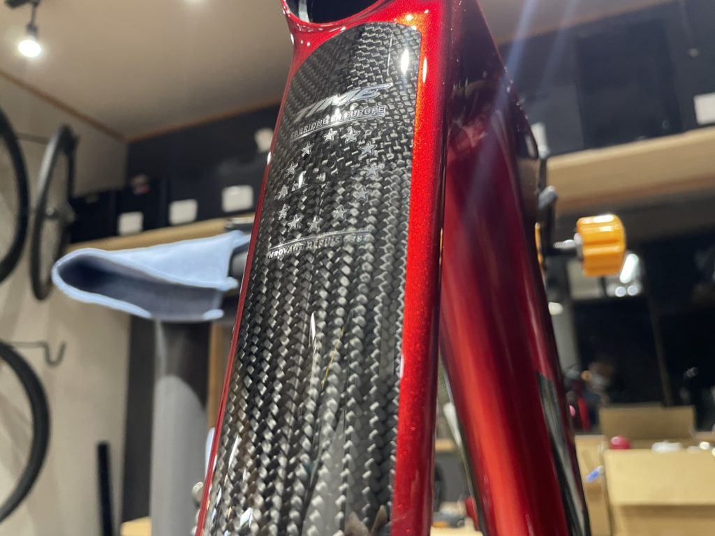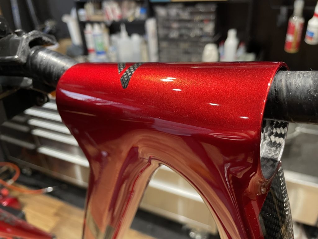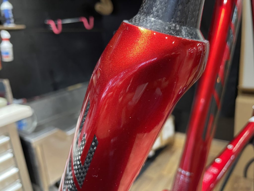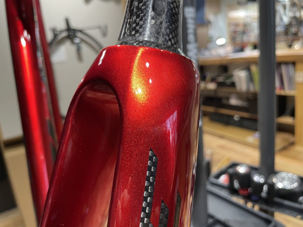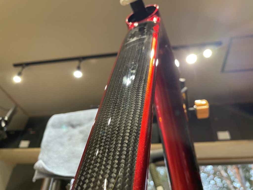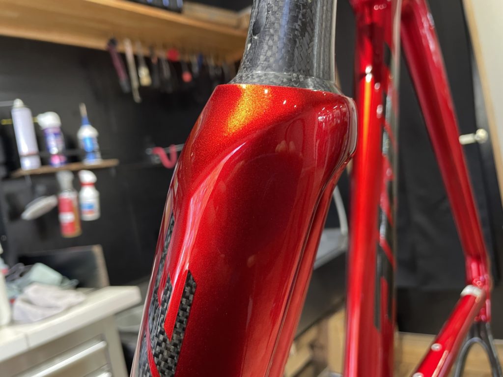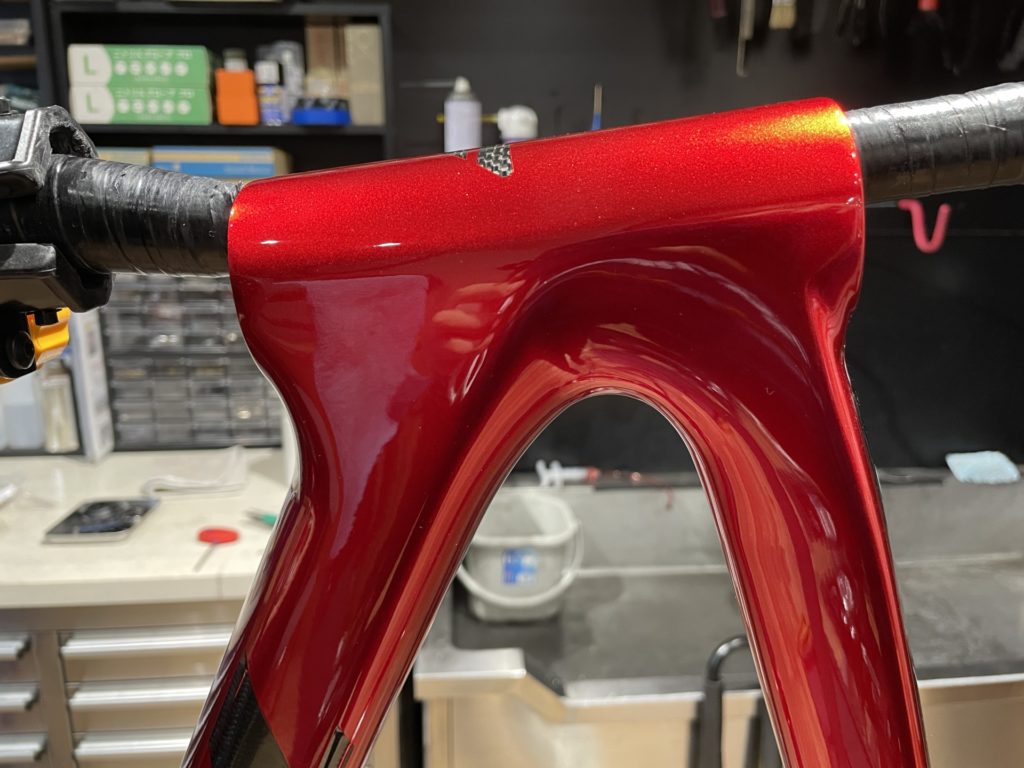 TIME ALPE D’HUEZ DISC F/S(タイム アルプデュエズ ディスク フレームセット)カラー:ブリリアントレッド(V35)にガラスコーティング「ガラスの鎧(クレストヨンド社)」を施工しました。