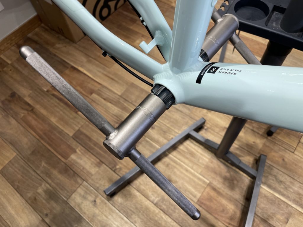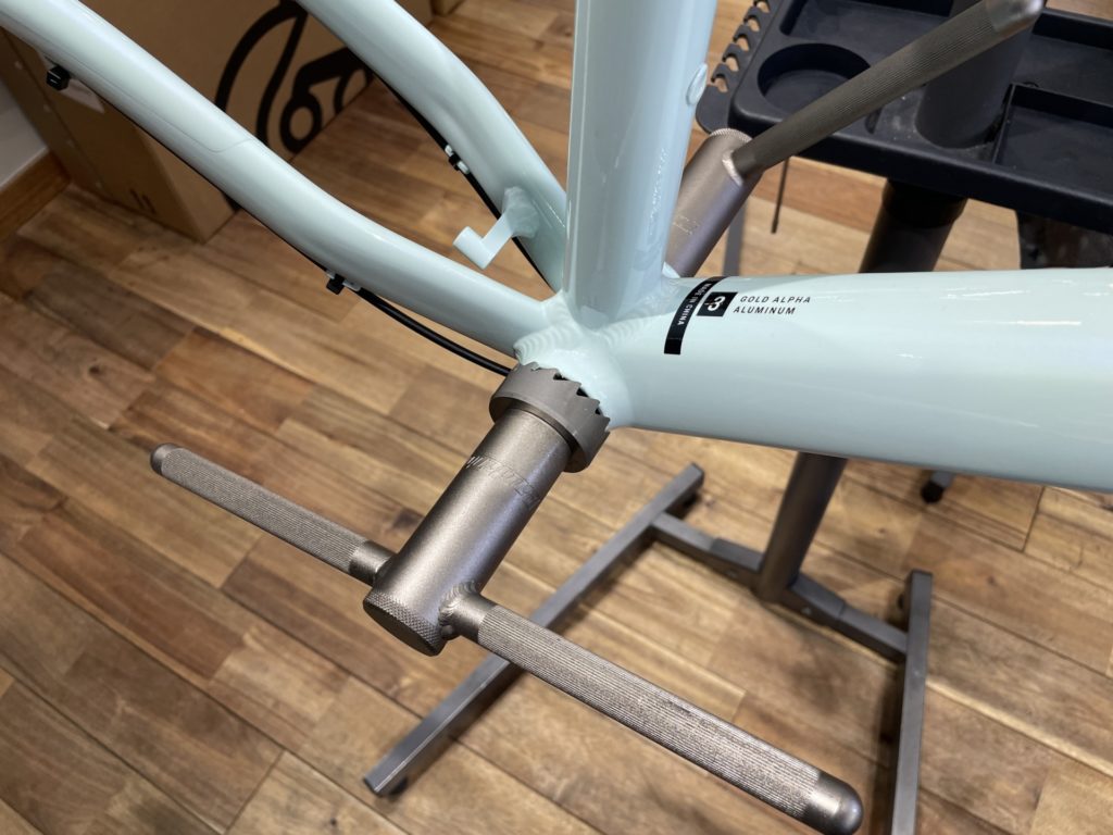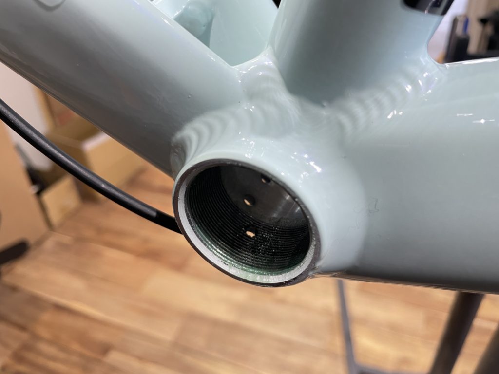 各コンポーネントを分解後はフレームのBB受けから調整します。ドライブトレイン側とノンドライブ側にボトムブラケットの取付精度を高めるため、タッピングとフェイシング加工を行っています。 また水分が入り込みやすい場所であるため、錆に強いグリスを塗布し取付を行います。
