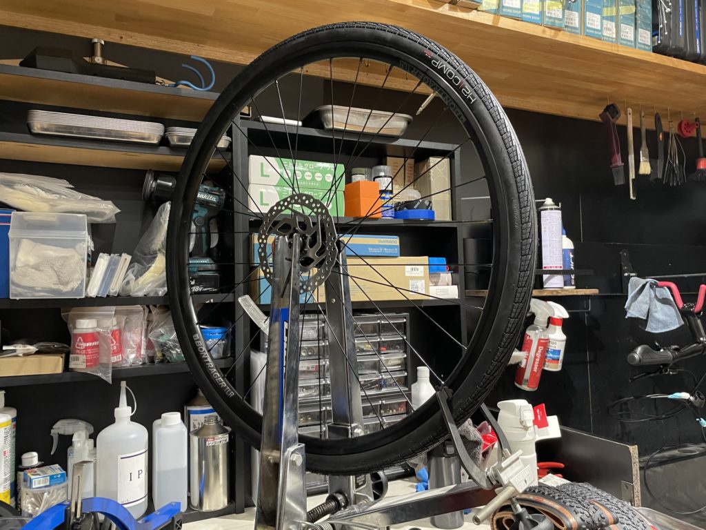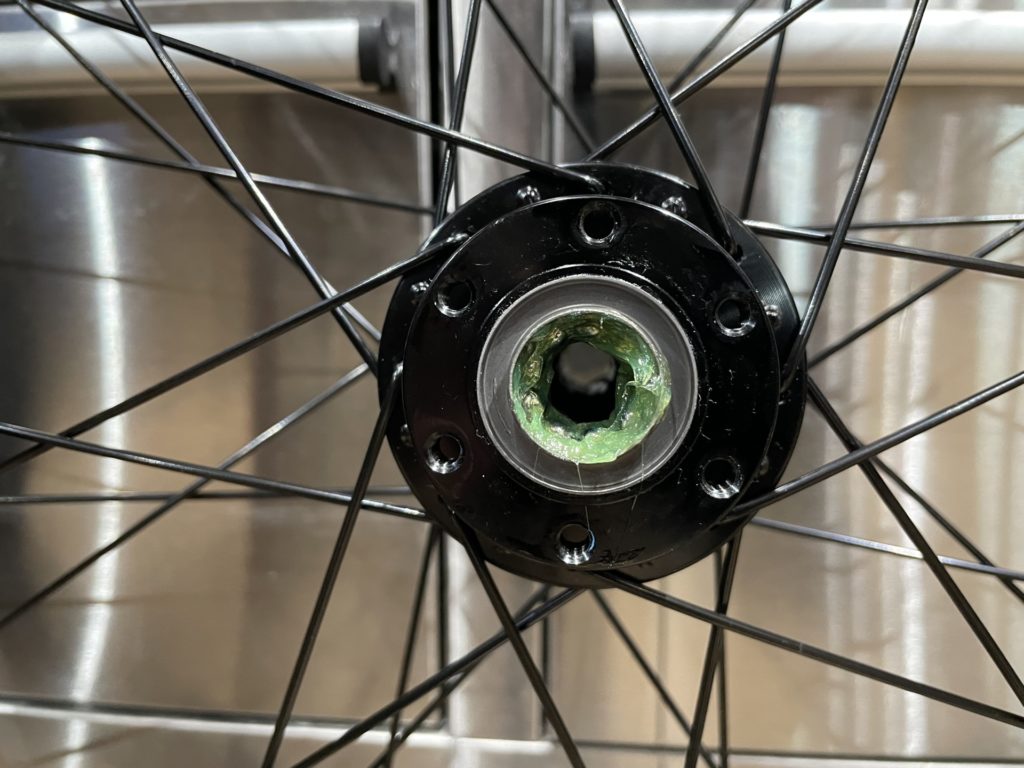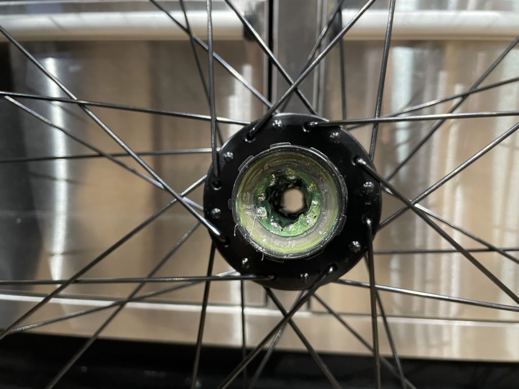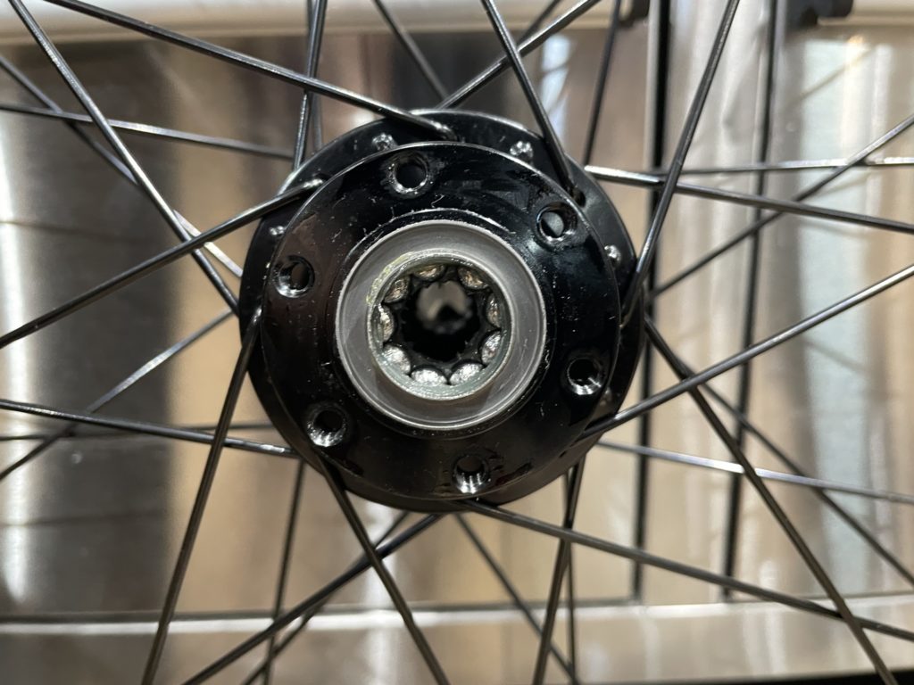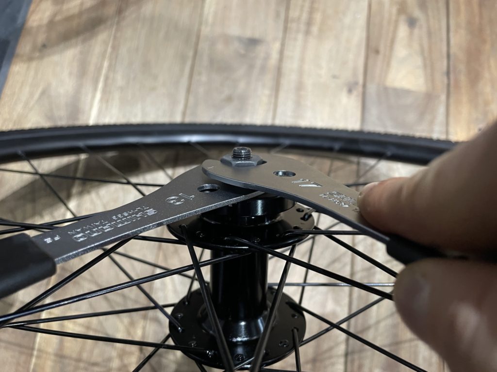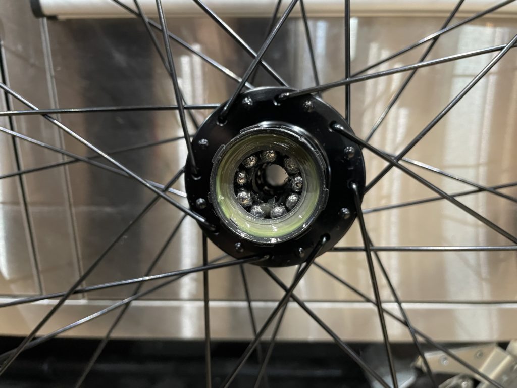 ホイールはベアリングの状態を確認するために分解。工場でのグリスが少なかったり、グリスの劣化が見られた場合はこちらで再塗布を行います。またカップアンドコーン式ベアリングの際は回転性能の向上とベアリングボールの摩耗を最小限に抑えるために丁寧に玉押し調整を行います。