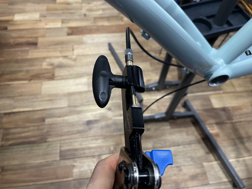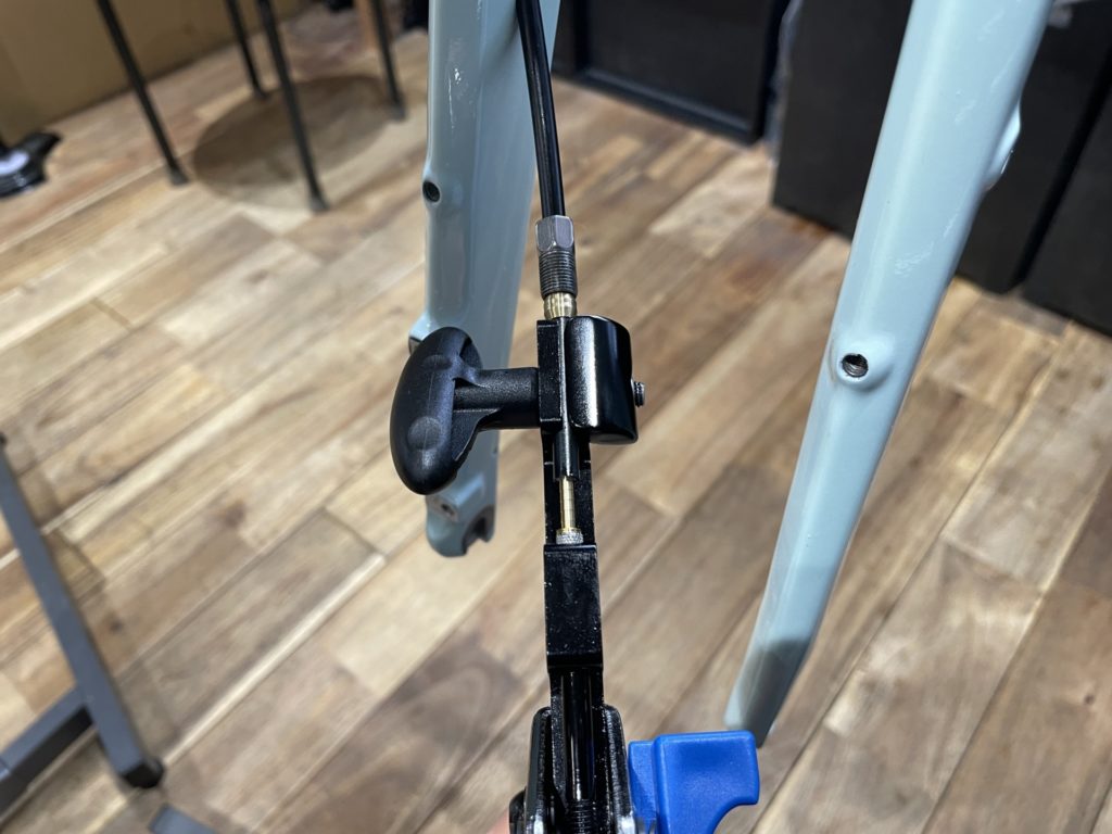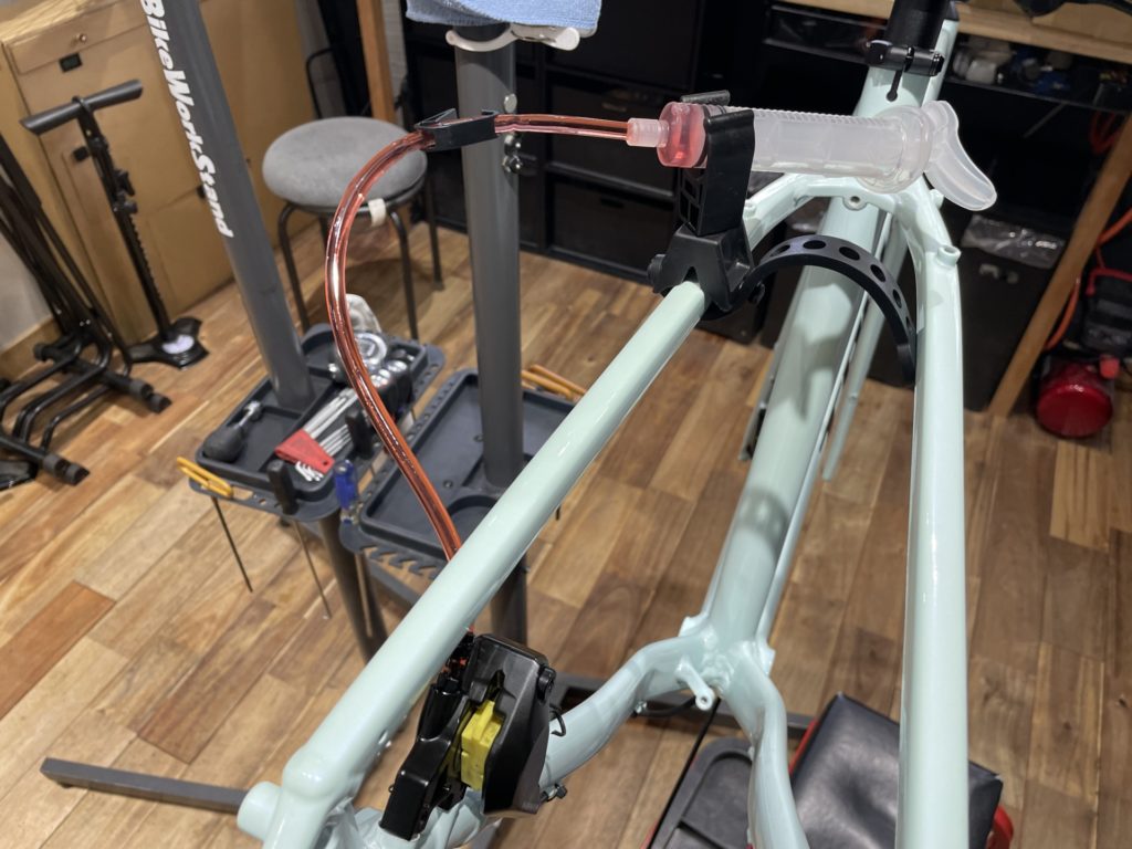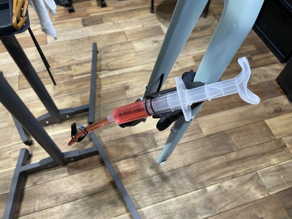 油圧ディスクブレーキの場合、ブリーディング作業(オイル交換)を行います。