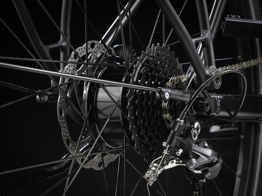 リアハブモーターを採用したことで、見た目は完全に普通のバイクのままです。ボトムブラケット部のセンサーでキャッチしたペダリングパワーとケイデンス信号を、コントロールユニットに送ることで、スムーズでダイレクト感のあるパワーフィーリングを実現しました。