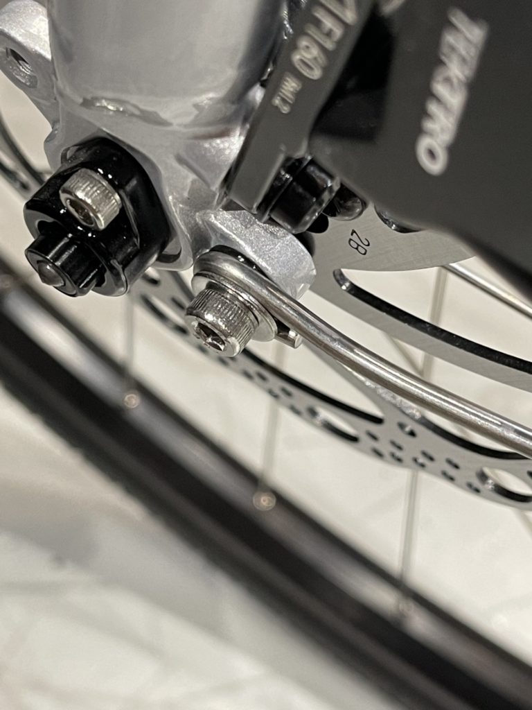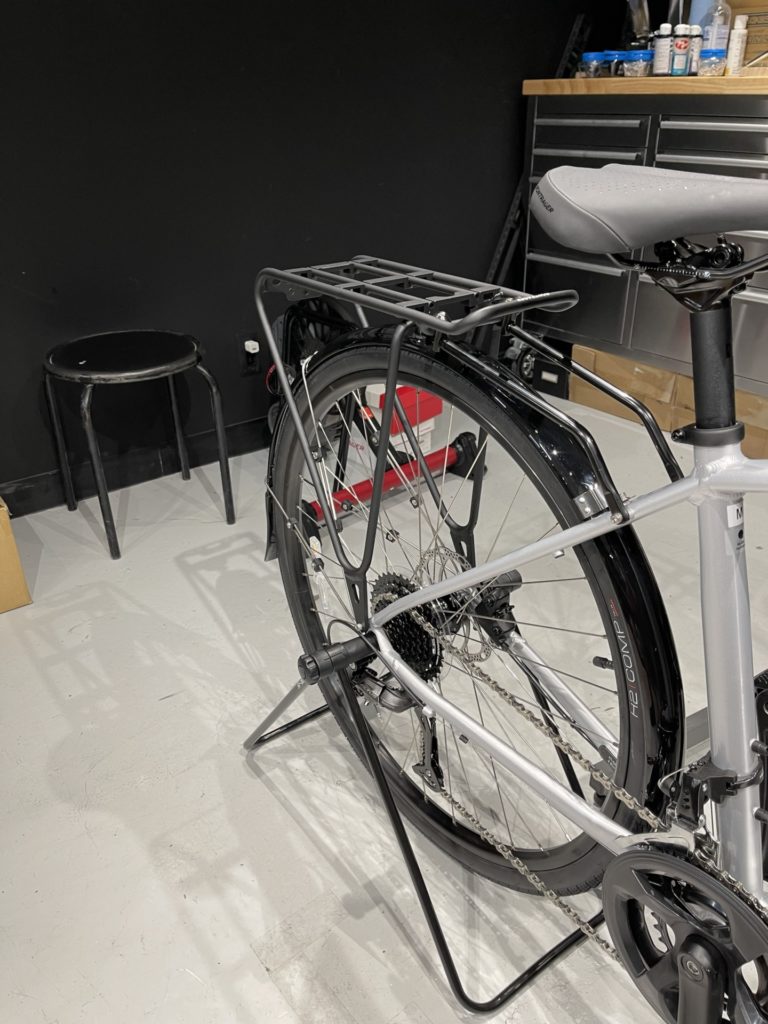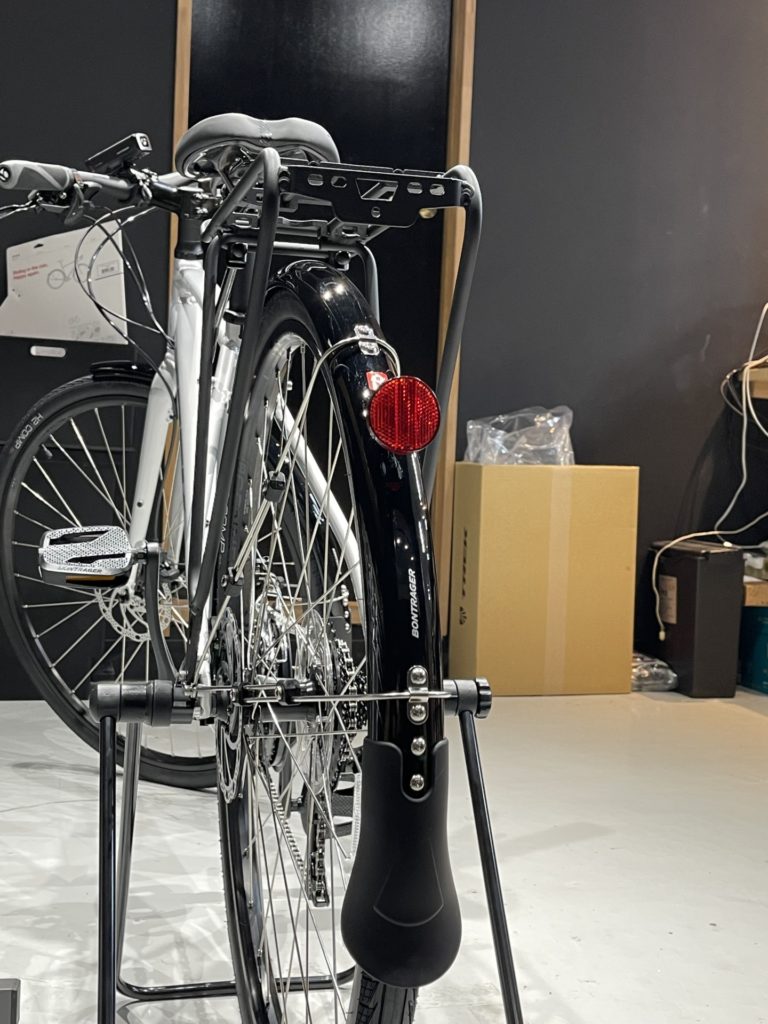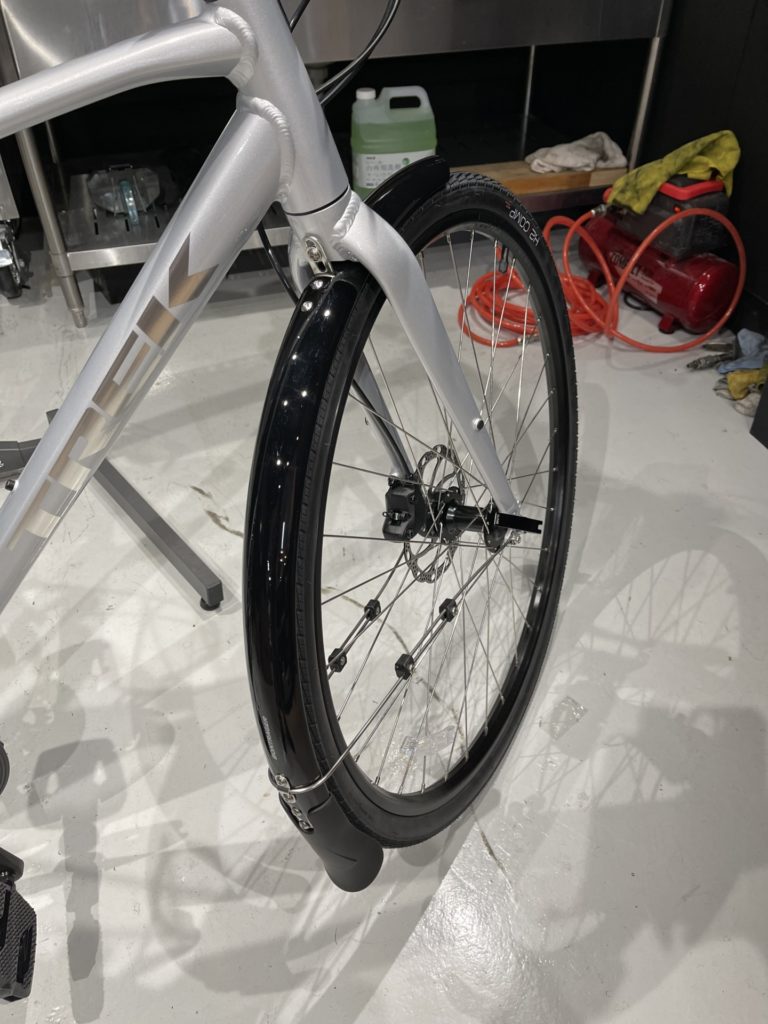 今回仕上げさせていただきましたテーマは実用性。定番のキックスタンドとキャリア、そして少し加工させていただきましたフェンダー(泥除け)を装着。シートポストに鍵やら、キャリアなどが取り付けられると標準装備のリフレクターが隠れてしまい、後方からの視認性が著しく低下してしまうため、フェンダーのリアライト台座を少し加工してリフレクターに代えさせていただきました。フェンダーのステーはフレームの塗装を痛めてしまいますので樹脂製ワッシャーを噛ませてお取り付けいたしました。今後フェンダーを外した際に擦れキズや塗装剥離があると悲しいですからね。フロントライトにはとても悩まれた結果、夜間走行も多いこともあり最大1300ルーメンを誇るBontrager Ion Pro RT Front Bike Lightをセレクト。光量の低いライトでもLEDであれば離れたところからでも光が通るのですが、ヘッドライトを点灯した車の脇などに入ると車の光量差が大きすぎて視認性は全くなくなってしまうんですよね。でも今回のライトでしたら安心です♪