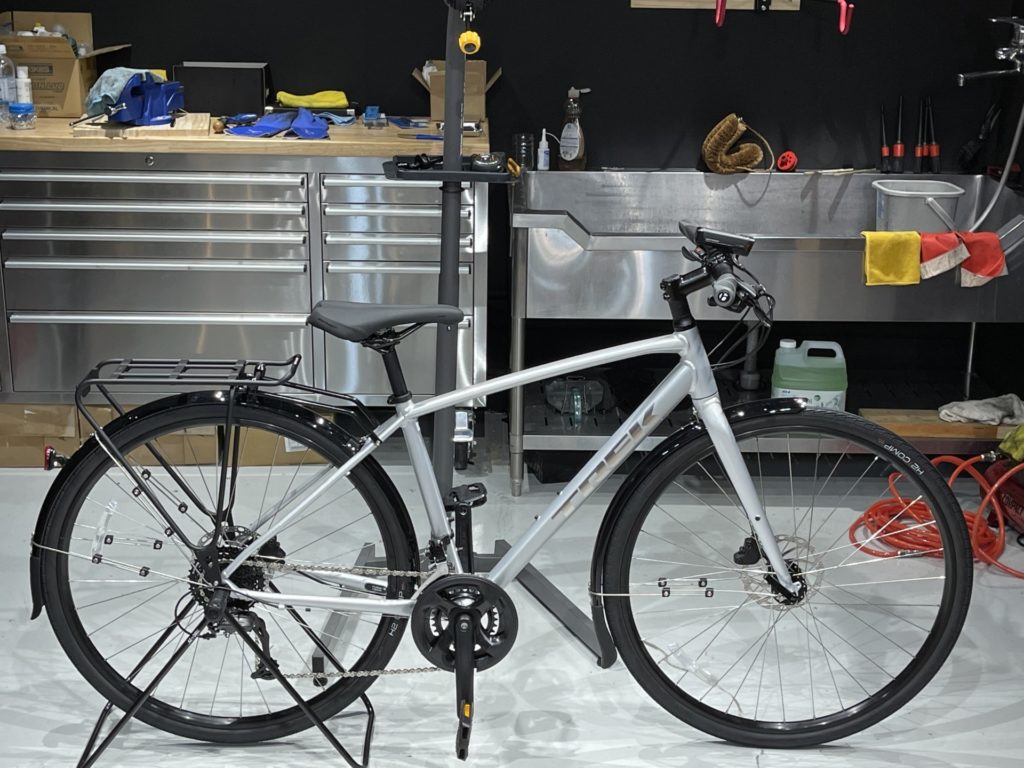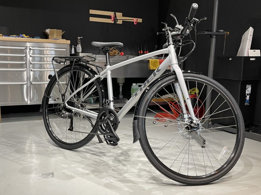 日暮れ時、以前は車が大好きだったというお客様が奥様とご来店いただきました。今は多数所有していた車もお買い物車両だけとし、何か楽しい移動手段はないかと考えられていたようでした。車同様に走りの楽しさや軽快さを存分に楽しむようでしたらと、E-bikeやロードバイク、MTBなど主要なスポーツバイクの特徴をご説明させていただきましたが、まずはスポーツバイクの入口でもあるクロスバイクからスタートしてみていただくことになりました。お選びいただきましたのは大人気クロスバイク”TREK FX2”。
