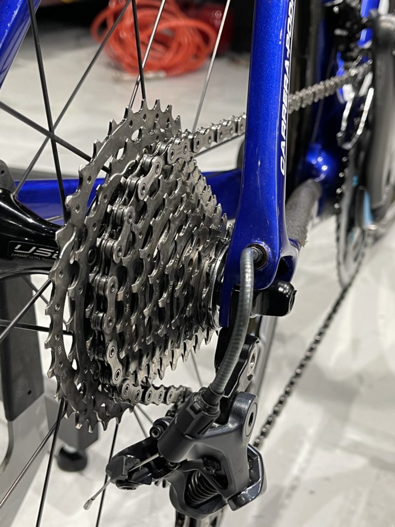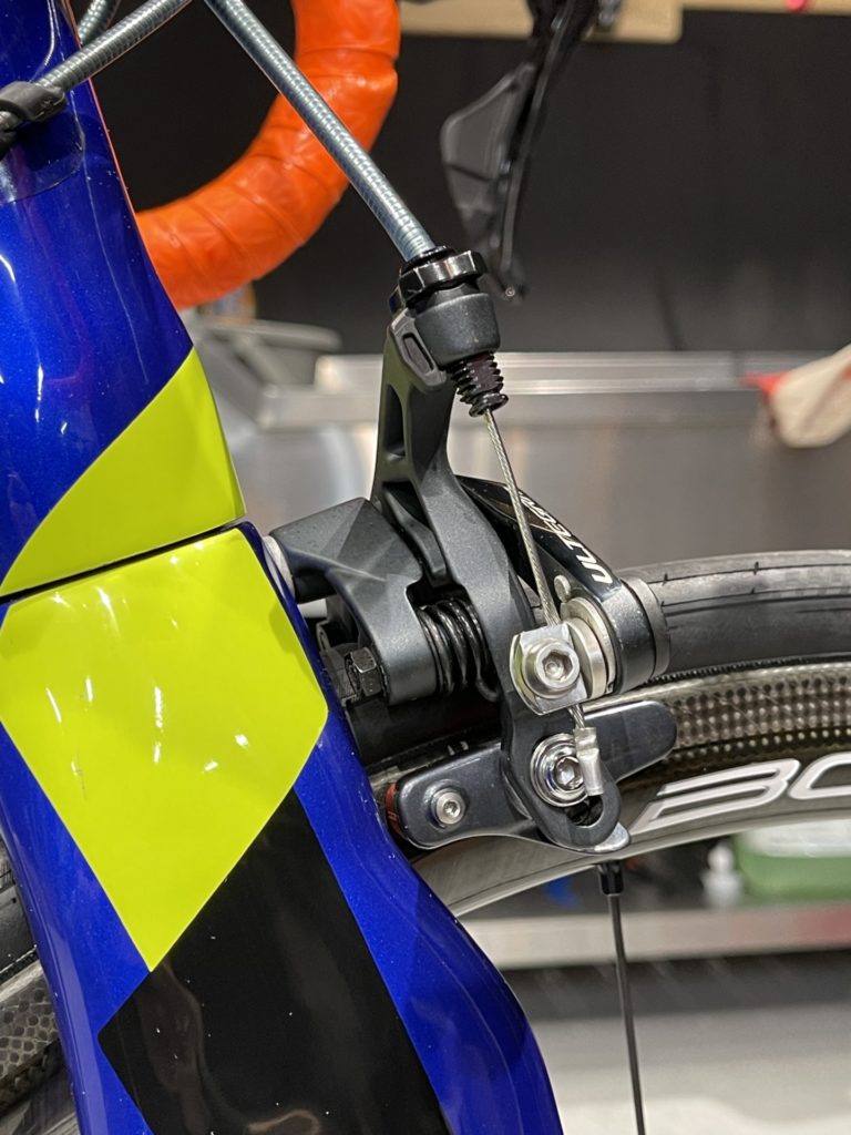 洗車してると様々な気付きがあります。こちらの車両はフロントディレイラーのサポートプレートが付いていませんでした。走行中に落ちてしまったのかなと思いつつ、よく見るとサポートプレートと対になっているサポートボルトがフロントディレイラー内に引っ込んだままでした。落ちてしまったのではなく付けていない状態でした。ショップで組立ててから数年間気づかずに乗られていました。こちらは後から付けさせていただきました。