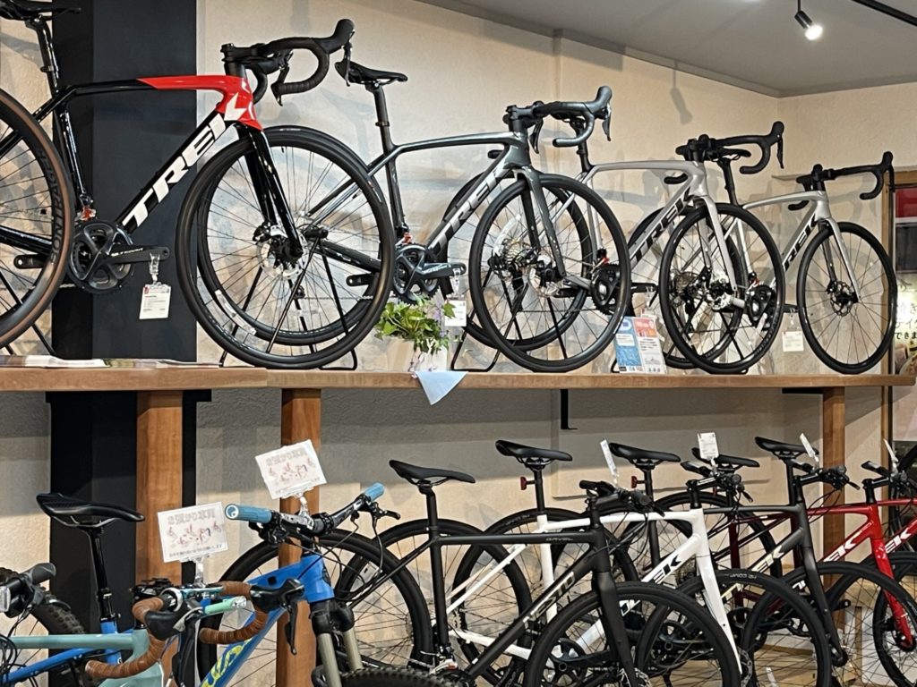 TREKの中でも不動の人気を誇るEmondaですが、当店でも大人気です。カムテール形状のパイプを使用しつつ軽量であり、尚且つ乗り心地がよく、硬すぎない。これほどホビーライダーにやさしい車体はないですね。しかも洗練されたデザインと業界屈指のクオリティを誇る塗装技術。特に人気なのはEmonda SL5と Emonda SL6 Di2 PROです。SL5に関しましてはお求めやすい旧カラーのシルバーが2台ございます。検討されているお客様には見逃せないタイミングです。詳しくは店頭にて。