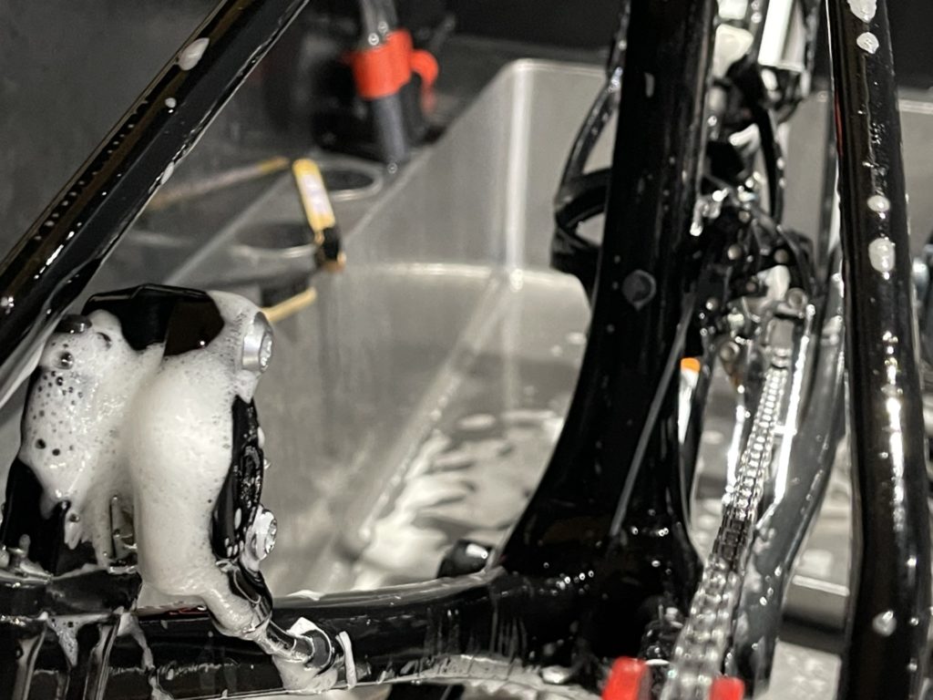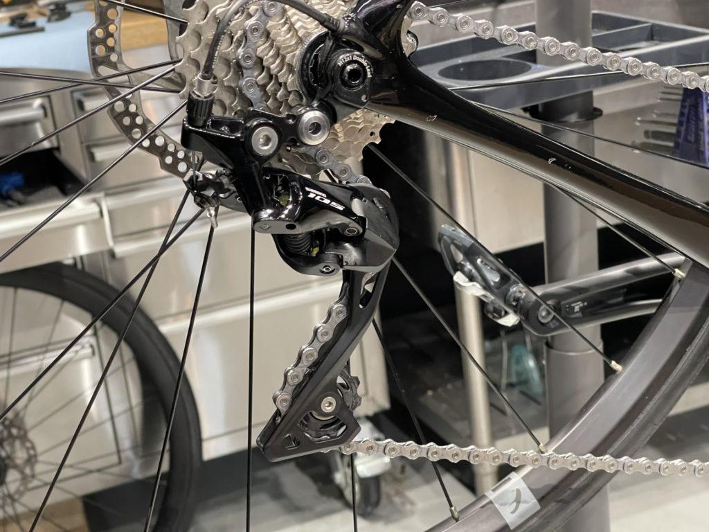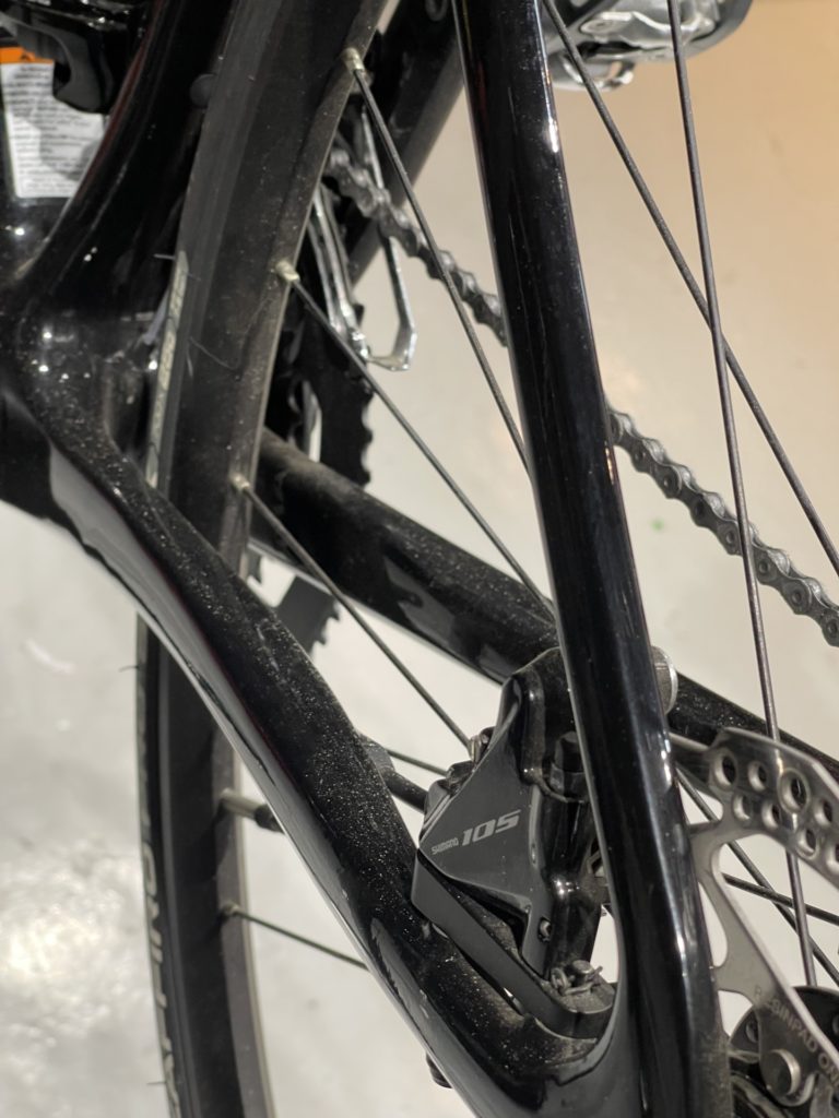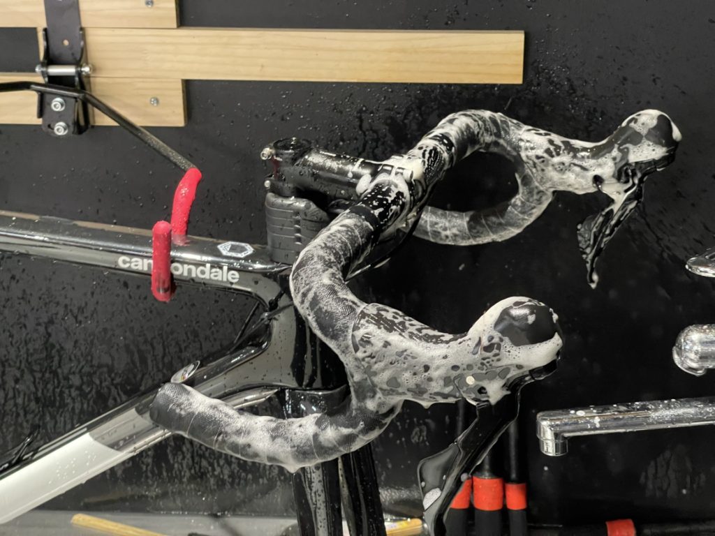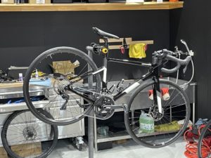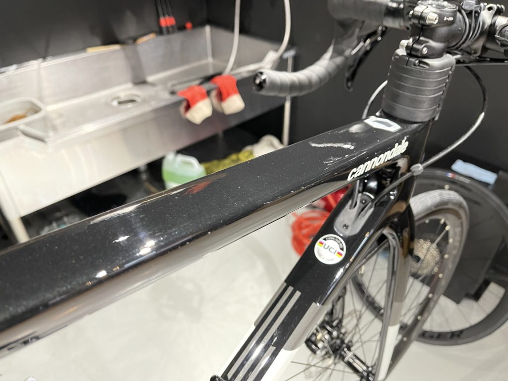 タイヤは耐パンク性に定評のあるBontrager AW3 Hard-Case Lite Road Tire 25Cと通常グレードのブチルチューブの組み合わせです。タイヤ換装後の洗車でしたのでタイヤごと洗車場へ突入し、ノリまで落とさせていただきました。付属品を取り外し、隅々まで洗浄していると、ポリマーコーティングの追加依頼をいただきました。本当は洗浄前に研磨させていただき洗浄後にコーティングさせていただくのがベストですが、こればかりは仕方がないですよね。しっかりめに磨かせていただき、しっかり脱脂してコーティング、そして拭き上げまで一気に仕上げます。ポリマーコートは時間がなくても簡単にできるからいいですよね。ご購入時に取り外し忘れているSHIMANOの親切シールを取り外し、WAKO’sのチェーンルブリキッド スピード を滴下し完了!またのご来店をお待ちいたしております。