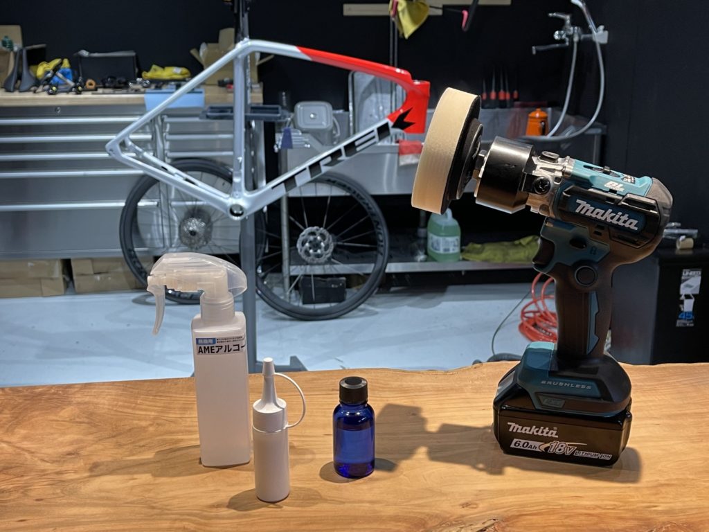まずはお馴染みのステッカー類、リフレクター等保護品の取り外しからスタート。前作までは振動時(ダンシング時)のダウンチューブ内部ケーブル干渉音対策は取られていませんでしたが、今回よりインターナルハウジングダンパーがデフォルトで装着されていますね。完成車への取り付けのために大量に材料を買い込んでしまっているのに。。。異音でお困りの方、作業承ります!そしてすべてパーツを取り外したら、ダブルアクション機能のポリッシャーを使用して鏡面に仕上げていきます。極微細コンパウンドを使用してブラックブースでもヘアライン一つ見えないほどに磨き上げ、洗浄、脱脂、コーティング。美しすぎますね。もともと塗装技術に定評があるトレックですので、お客様の手元に渡る窓口である販売店が丁寧に手を入れることで極上の仕上がりとなります。また見た目だけでなく、フレームの一部である永久接着されているクリア層を保護することでその輝きは長期にわたり持続します。