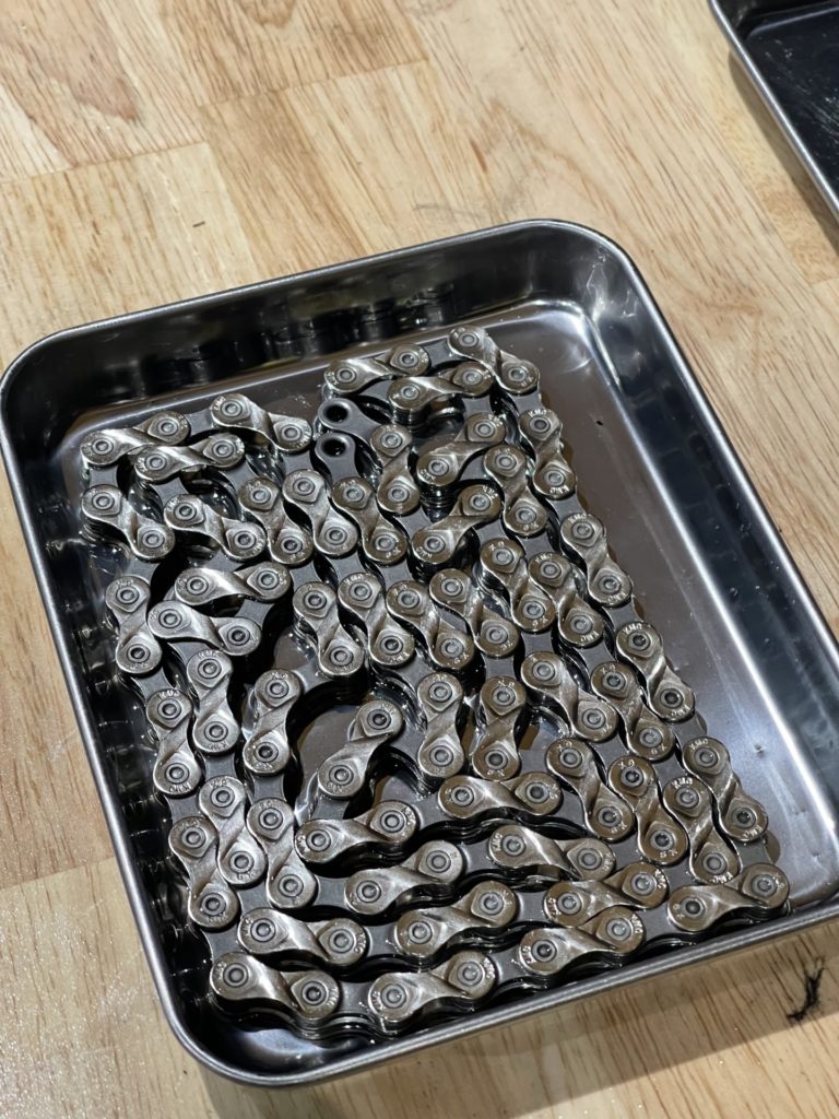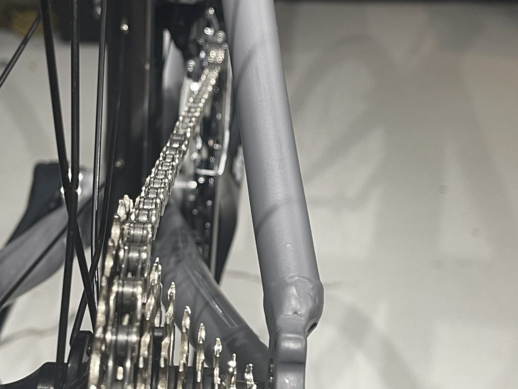 リアディレイラーハンガーの多少のゆがみはありましたが修正し、完了。さあ、問題なくバラし終わりました。上の画像は脱脂直後のフレームです。この後コーティングを施し、半日寝かせます。翌日硬化を確認し、一気に組み上げます。(完全硬化する5日目までは攻撃性のある洗浄液等をフレームに使用しないように。)
