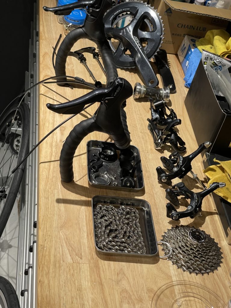 パーフェクト組み立てとガラスコーティングのご依頼もいただき、サイクリングへの想いや初めてのロードバイク”ネスト オルタナ”への愛情がしっかり感じられました。それでは、バラします。
