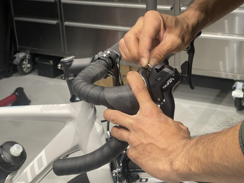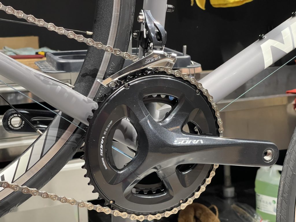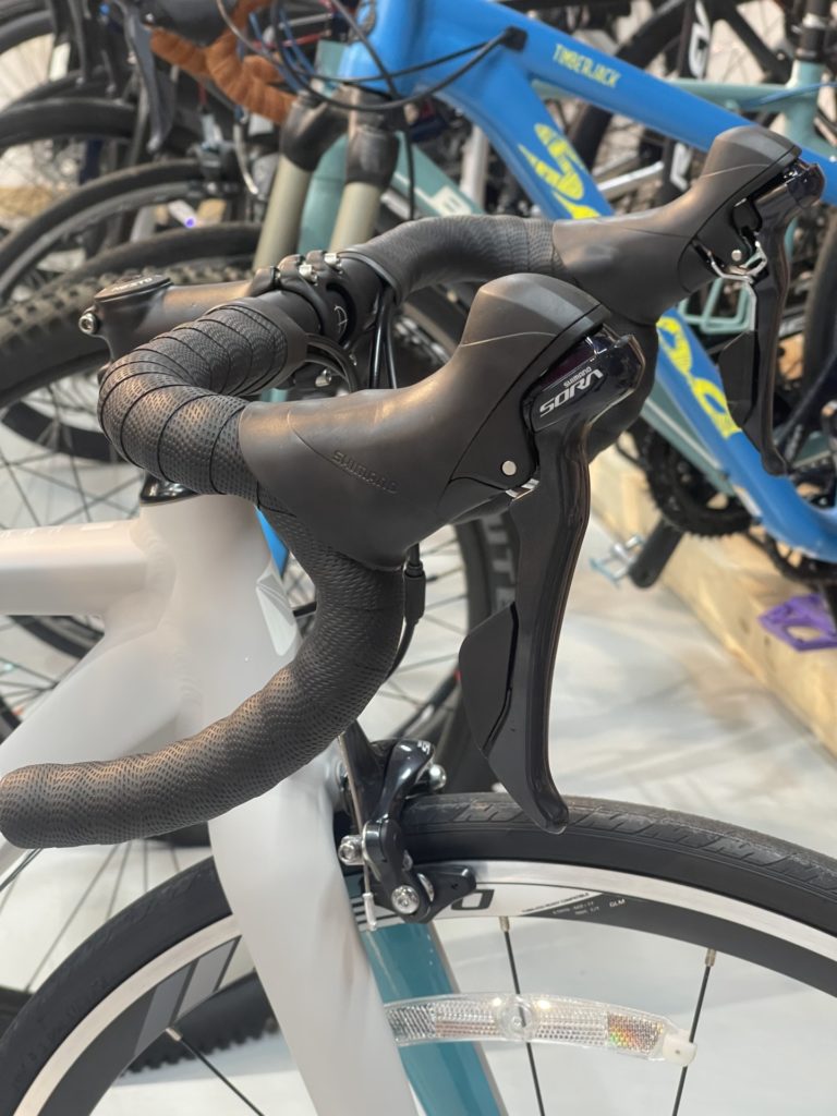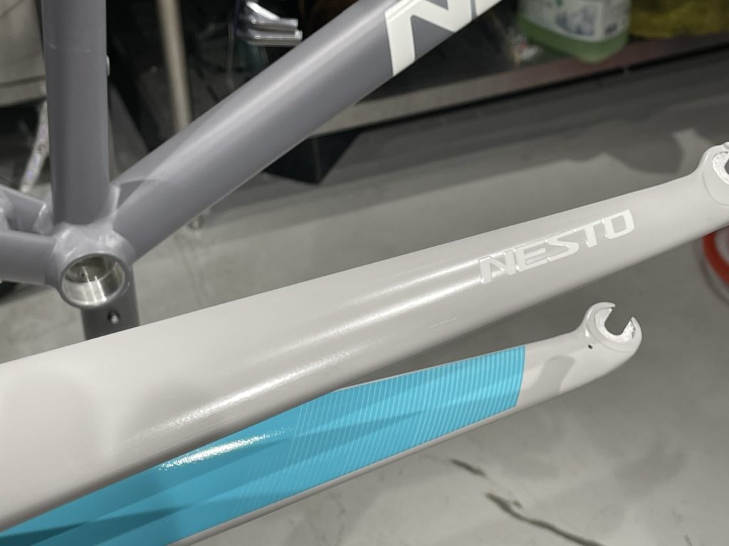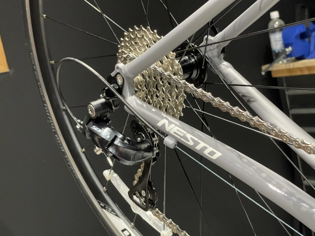 19時に閉店したら一気に組み立てます。バラ完はオーナーのことを考えながら組み立てるので、空いた時間でちょこちょこなんて作業はできません。いかに気持ちよく乗っていただけるか、どんなことをしたいのか、様々なことを考えながら閉店後の短時間に集中してボルトの一つ一つを締めていきます。様々な物・事を我慢して私に託してくださったと思います。ケーブルアウターにもしっかり手を入れて組み上げます。さあ用品もすべて取り付け、生まれ変わった”ネスト オルテナ”改めてオーナーとご対面。まだ少し大きなフレームなのでしっかりサドルに座った時の第一指間部はSTIにギリギリ届かなかったですね。STIレバーを少ししゃくり、また大きく開いたブレーキレバーは最もコンパクトになるように調整させていただき、ちょうどよく決まりました。ご試乗いただき、ご納車準備OK!まだ道路交通法を知らない年ごろかと思います。万が一間違った走行をしても目立つようにホイールのリフレクターはそのままにさせていただきました。時々メンテナンスに持ってきて色々聞かせてください。成長に合わせて快適に乗れるように調整いたします。