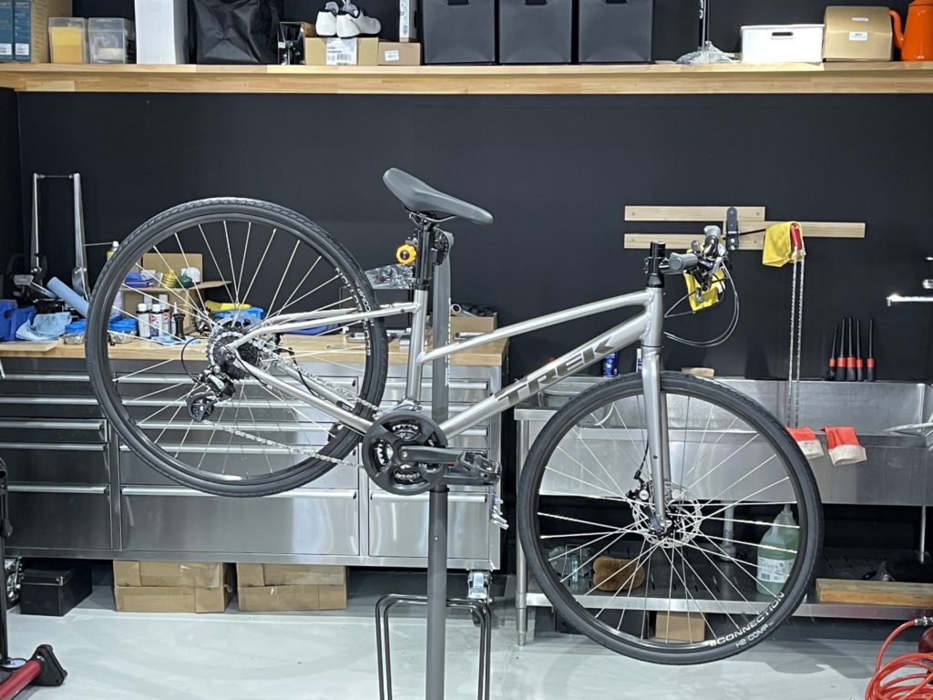 現在乗られているクロスバイクはかなり長い期間乗られていて、そろそろ新しいバイクに乗り換えようと思い、数あるバイクショップの中からSTAR☆BIKESを選びご来店いただいたとのことでした。学生時代は精力的にスポーツに勤しんでいたというオーナー、成人されてからも運動となると一生懸命体を動かしたくなるのだとか。私も一緒です。(笑)たくさんの方とお話ししているとよくわかりますが、スポーツを楽しむというのも2通りあり、適度に呼吸も弾んで運動して楽しかった(清々しく)という方と、一方では全力で運動して、呼吸を荒くして、体が動かなくなるまで力を出して楽しかった(非清々しく)。後者ですね。余談でした。