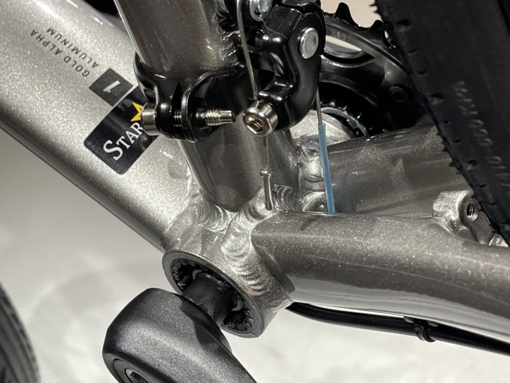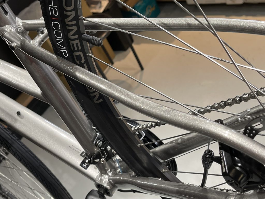 特徴的な外観をしておりますが、これはトップチューブが低く設計されたステップスルーフレームといい、小柄な型でも容易にクロスバイクを楽しむことができるようになっています。基本的な設計はFX1とは異なり、ヘッドチューブは長めになっており、ヘッドチューブは前へ延びるように寝かせたジオメトリとなっておりますので、直進安定性が高くどなたでも安心してサイクリングに出かけることができます。今回のオーナーはこちらの車体の外観に惹かれてのセレクトでしたので、本来の目的であるスポーティな乗車姿勢が取れるようにコラムスペーサーはすべてステムの上へもっていき、ハンドルの高さを低く整えさせていただきました。もし、もっと低くしてくれと要望があった際にはステムをロードバイクのように逆付けすることで低い乗車姿勢も可能です。もしかすると、その際にステムを長くしてもいいかもしれませんね。
