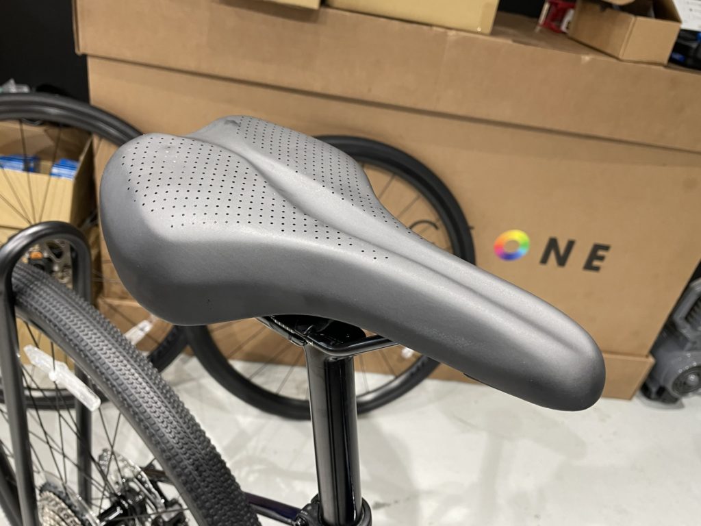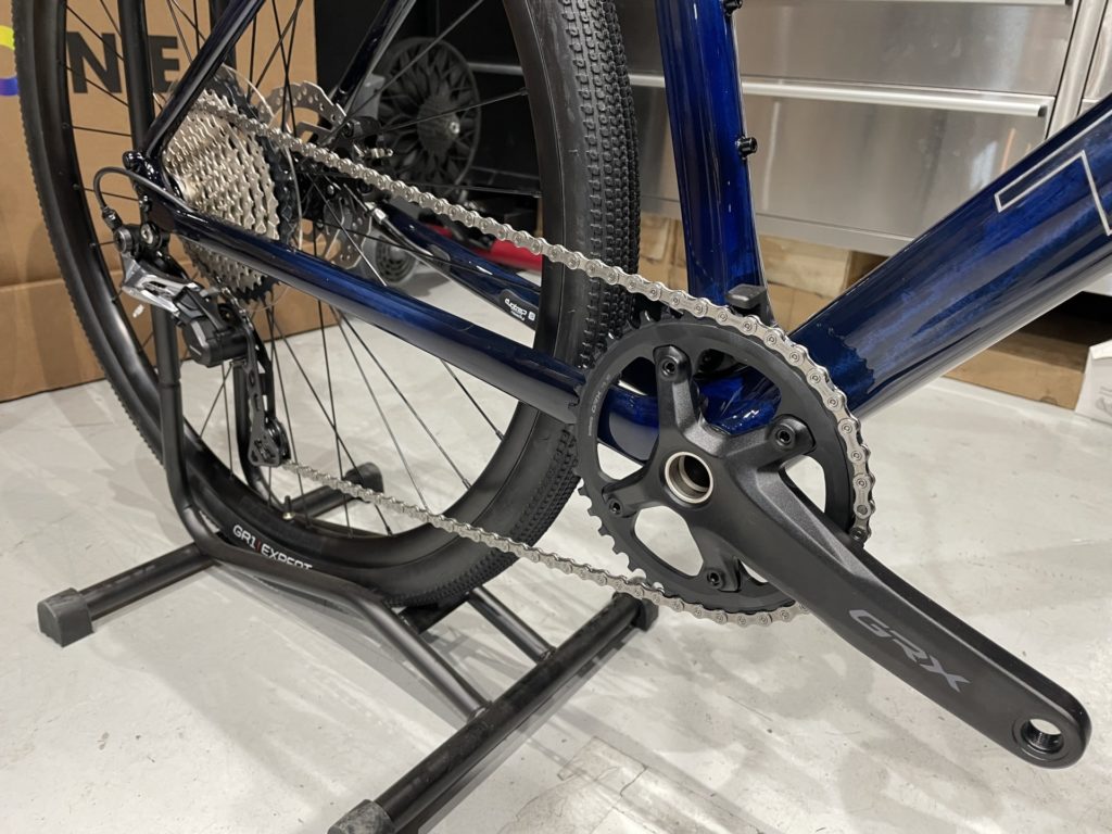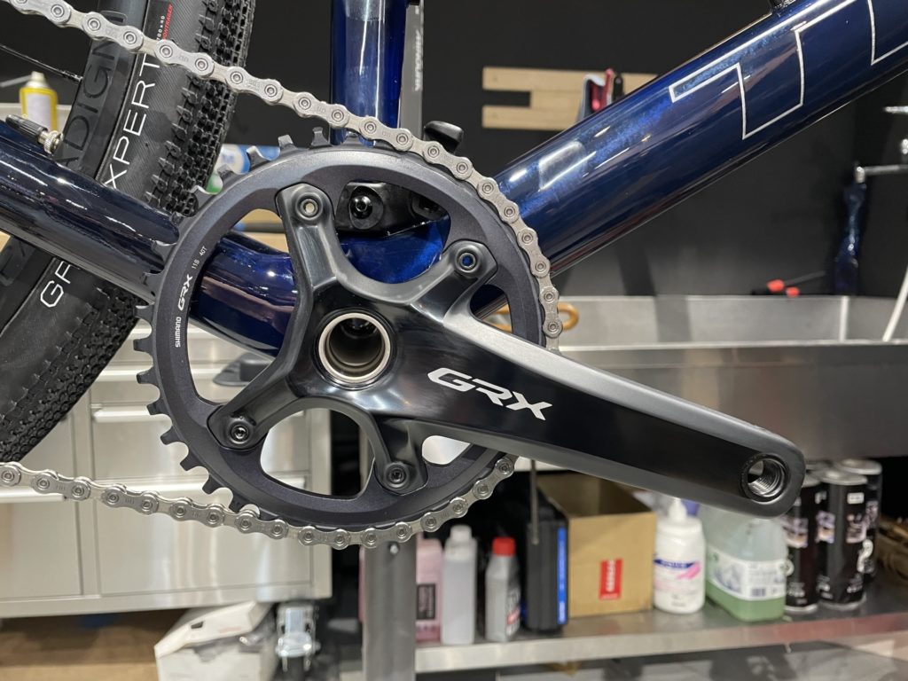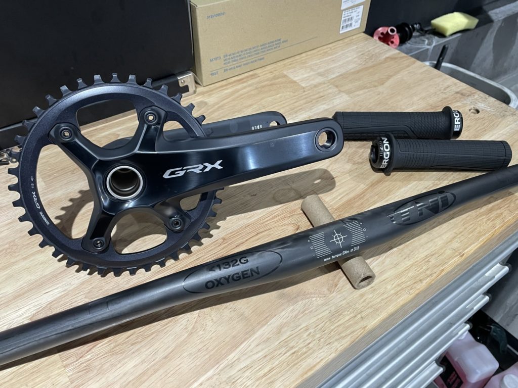 SHIMANO GRX(800シリーズ)クランク、OXYGEN カーボン・フラットバー。。そしてカーボンシートポスト。この3点でおよそ200gの軽量化に成功。